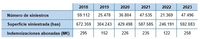 En conjunto, la superficie más afectada ha sido la de los cultivos herbáceos. Si bien, también resalta el alto valor de la producción dañada y las indemnizaciones en frutales, cítricos, caqui, viñedo u hortalizas. Lamentablemente, en el año 2023 se ha combinado la sequía más grave de la historia del seguro agrario con una de las mayores incidencias por pedrisco desde su creación en 1980..jpg)