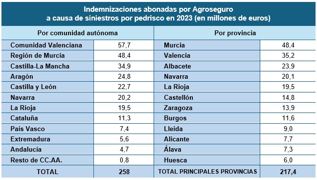 Estas tormentas de pedrisco registradas en 2023 provocaron daños por 258 millones de euros, un 110% más que en 2022 y también la cifra más alta desde 2018. Agroseguro ha abonado indemnizaciones a productores asegurados en 49 provincias (todas, a excepción de Las Palmas). La mayor cuantía corresponde a la Región de Murcia (48,4 millones), debido al alto valor de las producciones afectadas por las constantes y severas tormentas de granizo, como son cítricos, melocotón, albaricoque, uva de mesa, melón o sandía. A continuación, se sitúan las provincias de Valencia (35,2 millones, principalmente en caqui, cítricos y viñedo) y Albacete (23,9 millones, con especial incidencia, sobre todo, en viñedo, melocotón, albaricoque, lechuga, brócoli y cebolla).