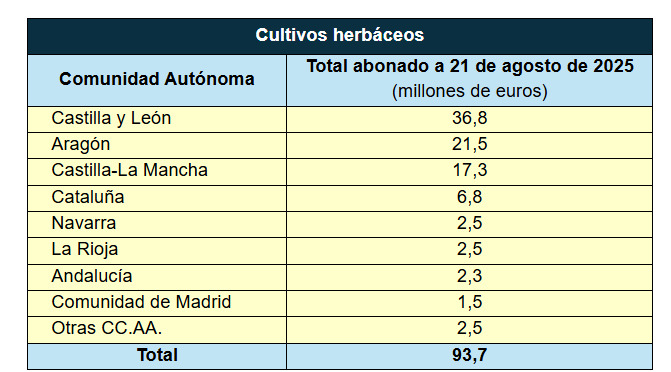 Durante el presente mes de agosto, Agroseguro ha continuado pagando las indemnizaciones correspondientes a daños en la cosecha de 2025 de cultivos herbáceos, principalmente por tormentas de pedrisco en explotaciones de cereal de invierno. La entidad ha anunciado que hasta la fecha ha desembolsado un total de 93,7 millones de euros por siniestros registrados en estos cultivos, lo que ya supone el 80,6% de la estimación para el total de la línea y por todos los riesgos ocurridos. La cantidad más elevada de los pagos realizados (36,8 millones) corresponde a productores asegurados en Castilla y León.