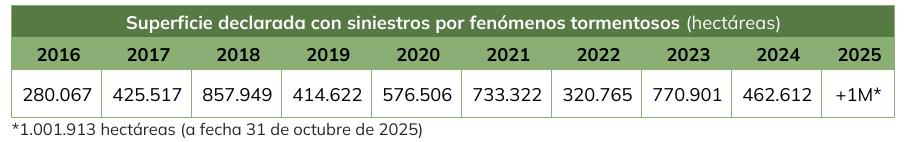 Agroseguro ha superado por primera vez el millón de hectáreas aseguradas con una declaración de siniestro como consecuencia de las tormentas de pedrisco, lluvia torrencial o persistente y viento. Concretamente, a fecha de 31 de octubre la superficie con declaración de siniestros se elevaba a los 1.001.913.