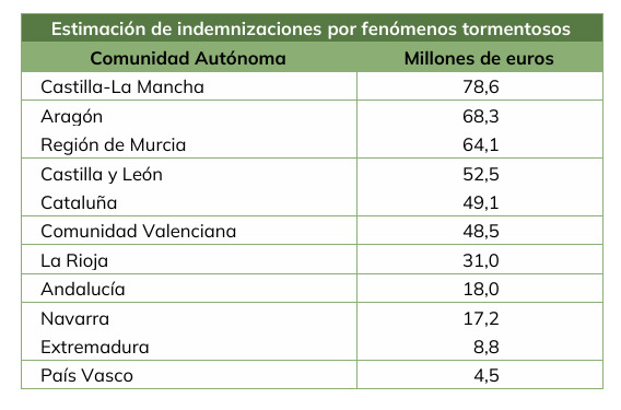 Esta cantidad se refiere a datos en explotaciones aseguradas en 27 líneas de seguro diferentes. De manera especial, el organismo destaca la severidad de estas tormentas sobre frutales (152 millones), herbáceos extensivos (106 millones), uva de vino (64 millones), hortalizas (49 millones) y cítricos (37 millones). Por regiones, Castilla-La Mancha, con 78 millones, y Aragón, con 68 millones, son las comunidades que suman los mayores importes de indemnización por actividad tormentosa.