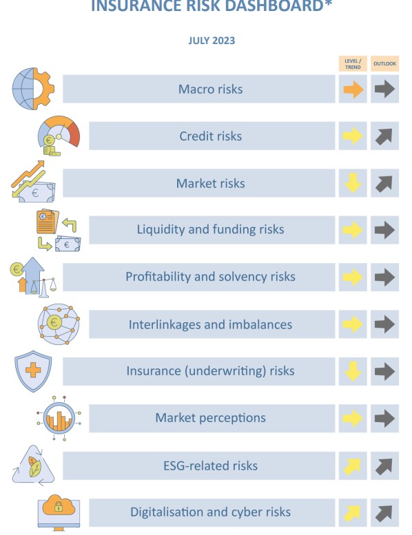 Eiopa ha publicado un nuevo Risk Dashboard donde muestra los problemas más acuciantes del seguro en Europa. De este informe se desgrana que los macroriesgos son actualmente la principal preocupación del sector. Apunta el supervisor europeo que "los niveles de riesgo se mantienen prácticamente constantes, y todas las categorías de riesgo apuntan a riesgos medios, con la excepción de los riesgos