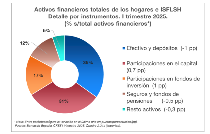 En cuanto a la distribución por componentes al final del período, el grueso de los activos financieros de los hogares se mantuvo en efectivo y depósitos (34,9% del total), por delante de las participaciones en el capital (31,4%), participaciones en fondos de inversión (16,6%). En seguros y fondos de pensiones se situó en el 12%, aunque con un descenso del 0,5%.
