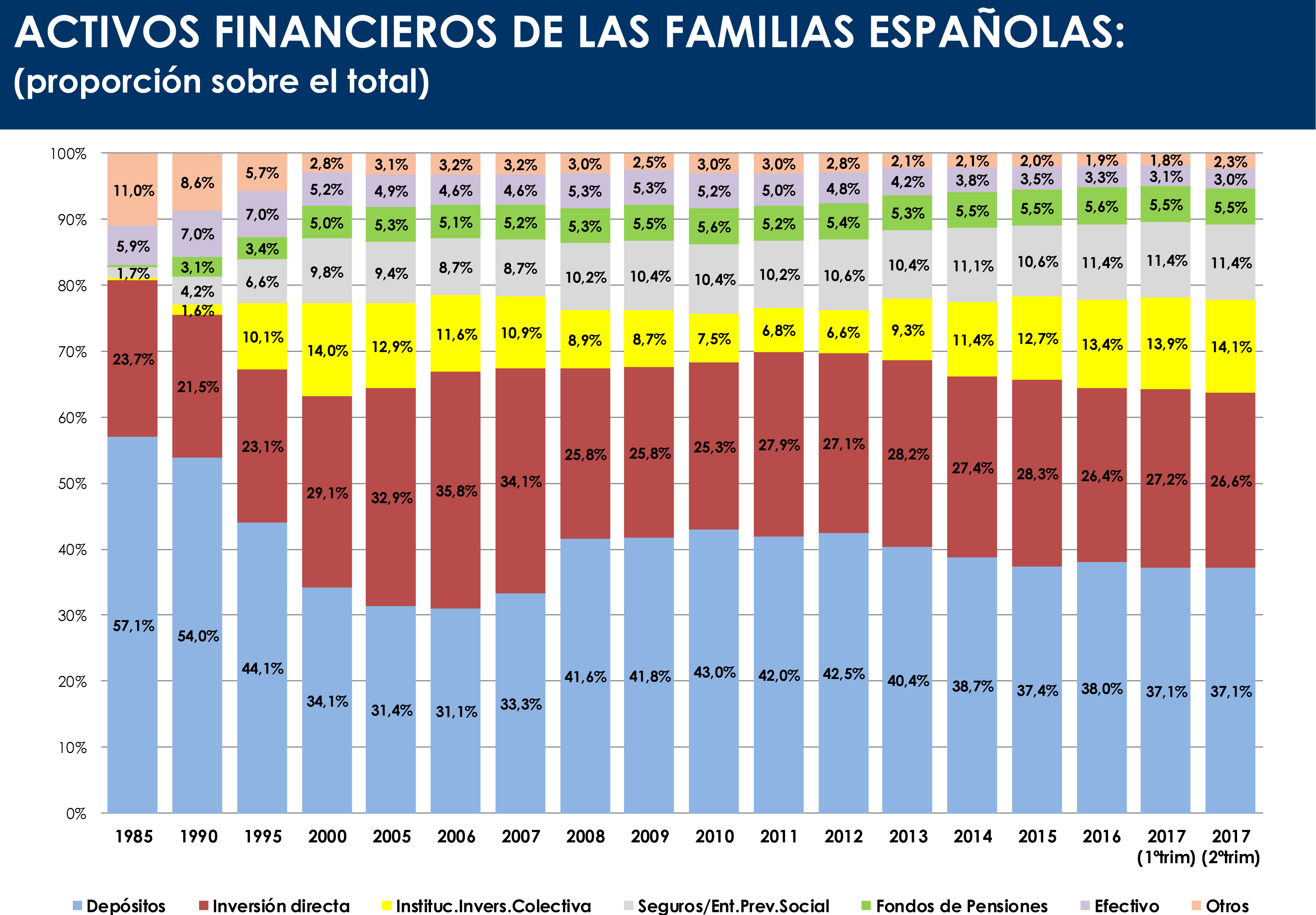 La apreciación de los activos de los hogares por efecto mercado en este 2017 ha contribuido en un 47% al crecimiento total de los activos financieros; el 53% restante correspondió a las adquisiciones por parte de las familias.