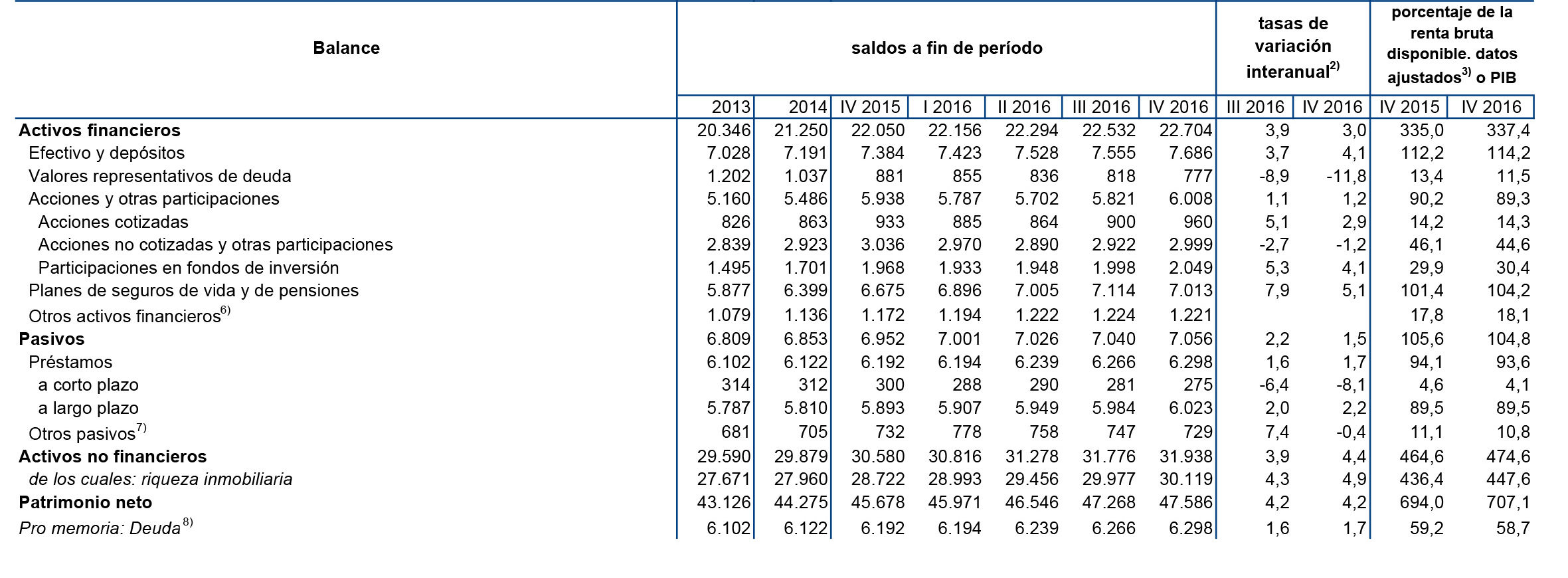 Según los datos del BCE, la inversión en acciones y otras participaciones se situó a finales de 2016 en 6 billones de euros (+1,2%), mientras en efectivo y depósitos se situó en 7,68 billones de euros (+4,1%).