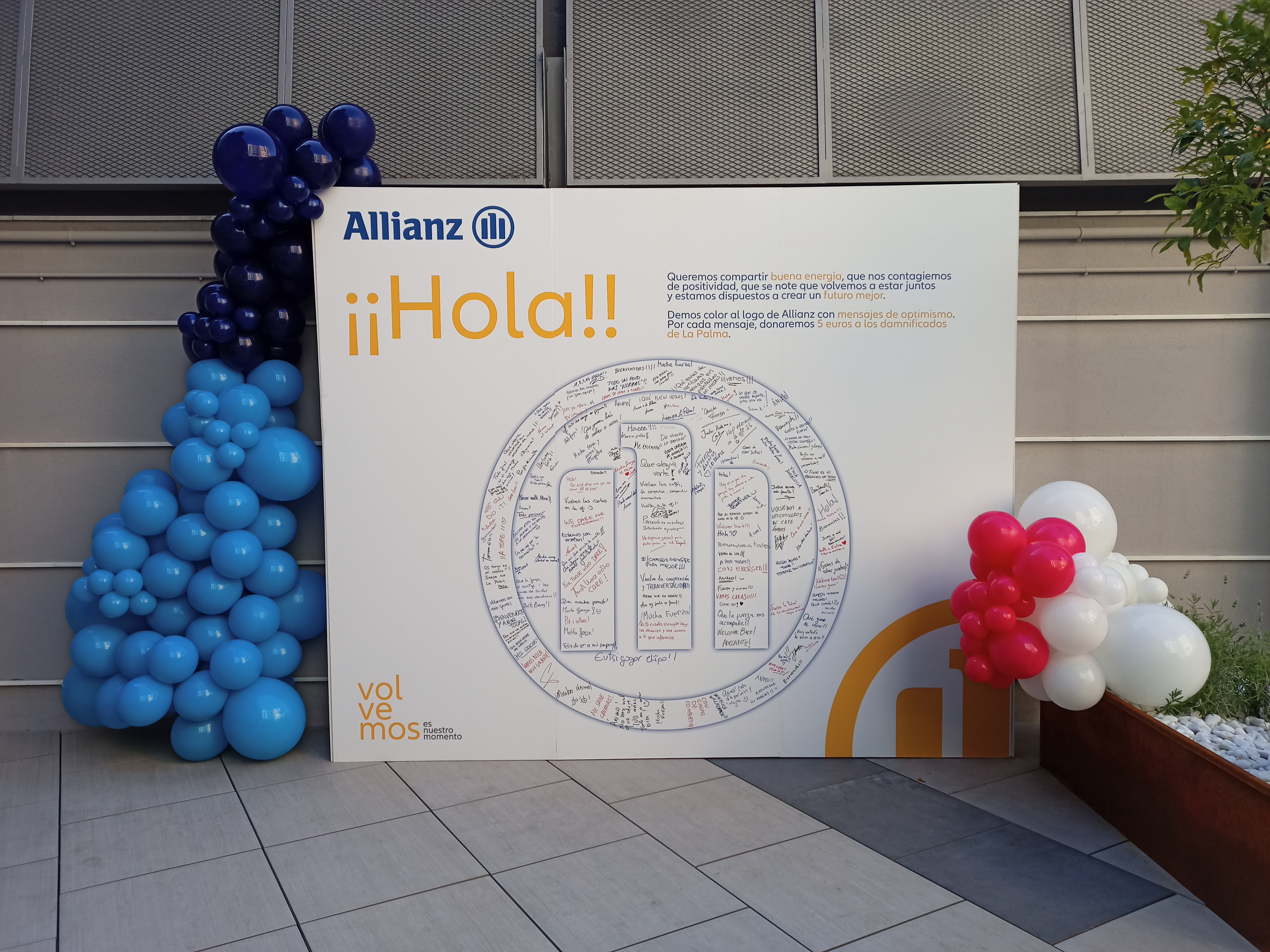 Aprovechando el regreso de sus empleados a la oficina, la aseguradora animó a la plantilla a mostrar su solidaridad. En concreto, invitó a los trabajadores a dejar mensajes optimistas para los afectados del volcán en murales ubicados en las sedes centrales de Madrid y Barcelona. Asimismo, habilitó un espacio en la intranet para promover la participación de aquellos empleados que no estaban en esas sedes. De esta manera, la aseguradora se comprometió a donar 5 euros a Fesbal por cada mensaje escrito.