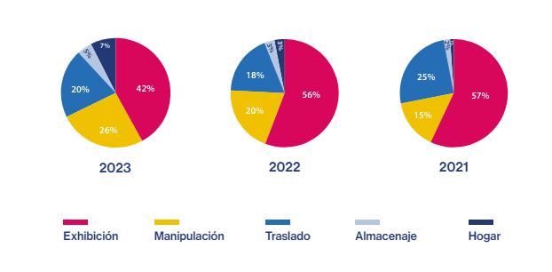 Por el contrario, los siniestros relacionados con la exhibición de obras se han reducido en 2023, aglutinando el 42% del total de los incidentes. Son 14 puntos menos que en 2022. Si bien, sigue siendo la fase donde se concentra la mayor parte de la siniestralidad. La exhibición se refiere al momento en el que la obra de arte ya está expuesta en un lugar específico, en posición estática y lista para ser mostrada.