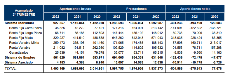 Los datos de Inverco confirman una caída en el ahorro a través de Planes de Pensiones. En la primera mitad del año el volumen de aportaciones brutas al sistema individual cayó un 16% respecto a 2021 (185 millones de euros menos que el mismo semestre del año anterior), lo que atribuye a la segunda limitación al ahorro impuesta a los Planes de Pensiones Individuales tras la reducción del límite de aportación hasta los 1.500 euros (desde los 2.000 de 2021). Este descenso en aportaciones brutas se suma a los ya acontecidos a finales de 2021, con una reducción del 40% respecto a 2020, recuerda Inverco.