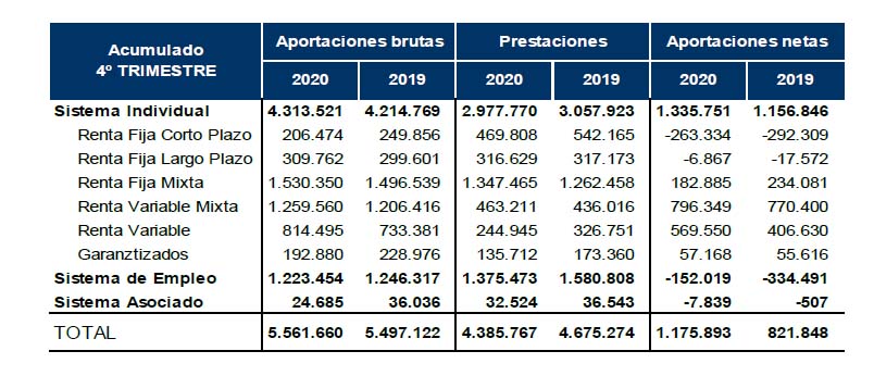 Por sistemas de Planes destacaron las aportaciones netas al Sistema Individual que alcanzaron los 1.336 millones, un volumen que no se registraba desde hace más de una década; Inverco también destaca que las prestaciones netas en el Sistema de Empleo bajaron a los 152 millones frente a los 334 de 2019.