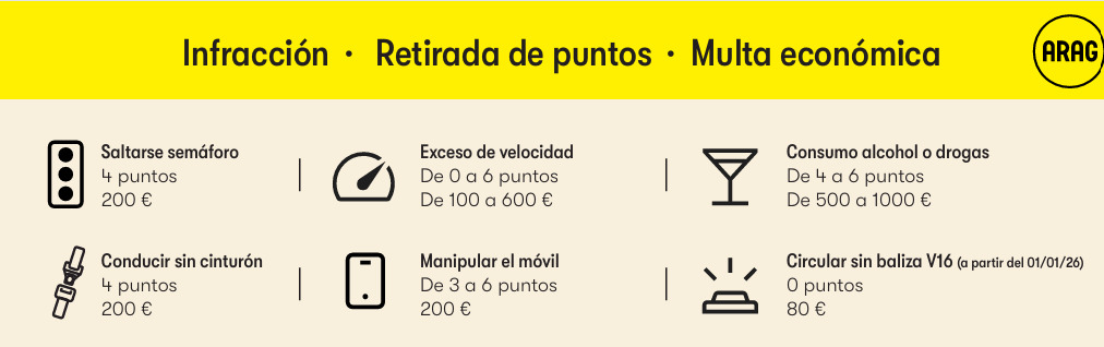 La aseguradora también menciona que en 2023, último año con datos de la DGT, cerca de 460.000 sanciones en toda España se tradujeron en pérdida de puntos del carné de conducir. Indica la entidad que las multas más comunes fueron saltarse un semáforo en rojo; el exceso de velocidad, el consumo de alcohol o drogas, conducir sin cinturón y hacerlo manipulando el móvil.