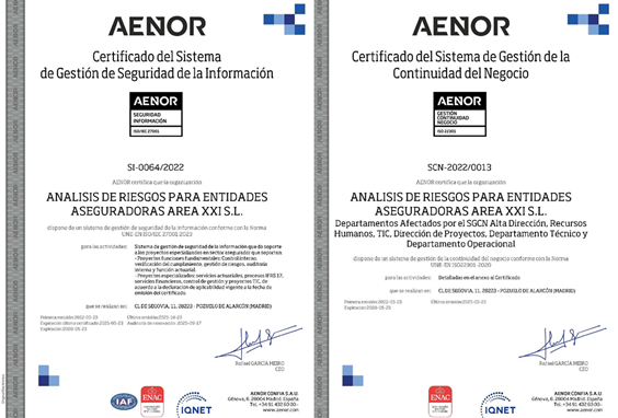 AREA XXI ha renovado con éxito sus certificaciones ISO/IEC 27001 y ISO 22301 emitidas por Aenor, actualizando la primera a la nueva norma UNE-EN ISO/IEC 27001:2023 y ampliando su alcance. "Estas certificaciones acreditan el compromiso de AREA XXI con la seguridad de la información, la continuidad del negocio y la resiliencia operativa, garantizando la protección de los datos y la calidad del servicio para sus clientes del sector asegurador", resalta. Además, la consultora subraya que con esta renovación "reafirma su apuesta por la mejora continua y la excelencia en la gestión".