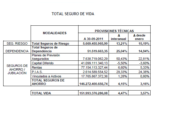 A 30 de septiembre de 2011, el seguro de Vida gestionaba ahorro de sus clientes por un valor global de 185.300 millones de euros, lo que supone un crecimiento en tasa interanual del 2,46%, según los datos facilitados por Unespa. De ese volumen total, 151.993 millones corresponden a productos de seguro, con un crecimiento respecto al mismo periodo del año anterior del 4,47%. El resto, 33.307 millones, es el patrimonio de partícipes de Planes de Pensiones gestionados por entidades aseguradoras, un ahorro que ha descendido un 5,35% entre septiembre de 2010 y septiembre de 2011.