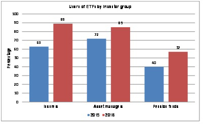 Los inversores institucionales europeos cada vez recurren más a los fondos cotizados (ETF) para mejorar la liquidez de sus asignaciones de renta fija y gestionar la volatilidad del mercado. Así lo pone de manifiesto un estudio realizado entre 132 inversores (65 Fondos de Pensiones, 48 fondos de inversión y 19 aseguradoras), encargado por BlackRock a Greenwich Associates. La principal novedad es el importante crecimiento del porcentaje de aseguradoras que utilizan estos instrumentos, ha pasado del 63% en 2015 al 89% en 2016, 26 puntos porcentuales (pp) más.