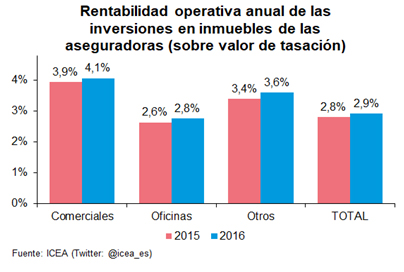 En 2016 la inversión en inmuebles de las aseguradoras les generó una rentabilidad del 2,9%, medida sobre el valor de tasación, con un aumento de 1 décima respecto al año anterior. Según los datos de ICEA, por tipo de inmuebles destacó la rentabilidad obtenida en los comerciales, del 4,1%.