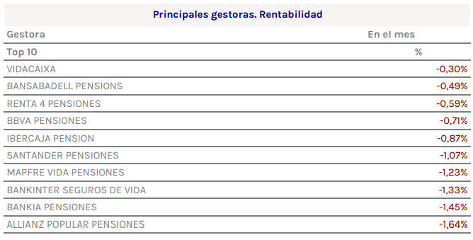Merchbanc ha sido la gestora más rentable en el mes, con una rentabilidad media ponderada de un 4%, seguida de Caja Ingenieros Vida, 1,2%, Abante, 1,2%, y PSN, un 1%. Entre las principales gestoras, todas se han situado en terreno negativo, siendo VidaCaixa la que ha tenido un mejor comportamiento con un descenso de un 0,3%, y Allianz Popular Pensiones la peor, con una caída del 1,64%.