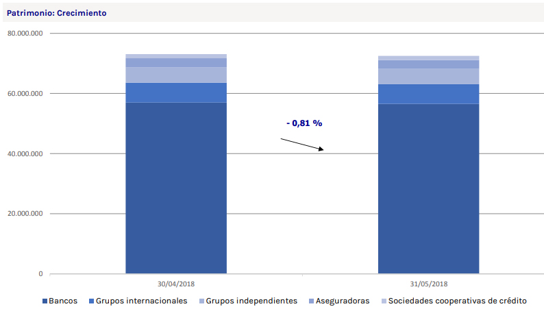 Por tipo de entidad, los bancos han sido los que han logrado las mayores captaciones netas, con 27,2 millones, seguido de las sociedades cooperativas de crédito con 5,1 y los grupos independientes, 1.2 millones. En cambio, han sufrido reembolsos netos las aseguradoras, 3,2 millones de euros, y los grupos internacionales, 17,4 millones. Las salidas de dinero de estos dos grupos unidas a las caídas del rendimiento de las carteras se han traducido en un retroceso del patrimonio del 1,15% en el caso de las aseguradoras y del 1,49% en el de los grupos internacionales.