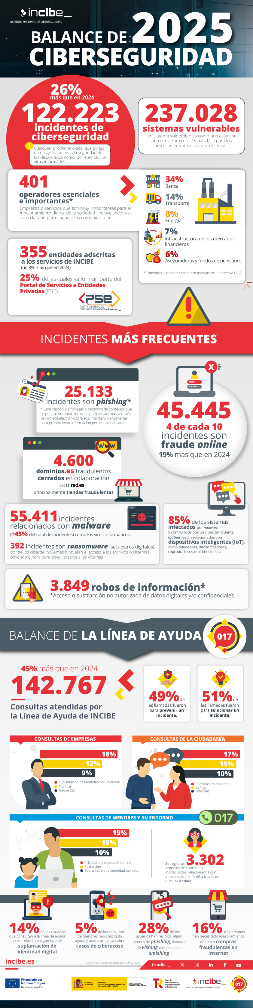 El Instituto Nacional de Ciberseguridad (Incibe), entidad dependiente del Ministerio para la Transformación Digital y de la Función Pública, a través de la Secretaría de Estado de Telecomunicaciones e Infraestructuras Digitales (SETID), ha gestionado, a través de su CERT (equipo de respuesta a incidentes de ciberseguridad) un total de 122.223 incidentes de ciberseguridad, lo que representa un 26% más que en 2024.