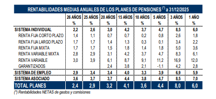 En cuanto a la rentabilidad, en el año se situó en el 6% para el total de Planes de Pensiones; y a largo plazo (26 años), la rentabilidad media anual se sitúa en el 2,4%. En el medio plazo (10 y 15 años), presentan una revalorización del 3,5% y 4%, respectivamente.