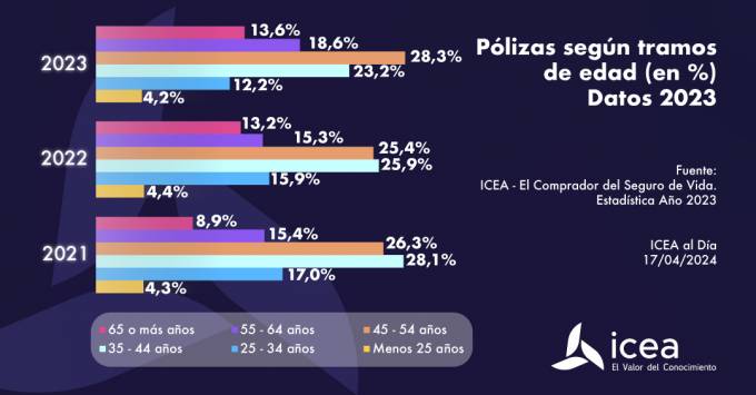 Los datos se desprenden del estudio anual de ICEA para determinar las características socioeconómicas y demográficas del comprador de seguros de Vida en 2023. Si se analizan las características de las pólizas de seguros de Vida según tramos de edad, un 28,3% de las pólizas corresponde a compradores de entre 45 y 54 años, mientras en el 23,2% de los casos la edad se sitúa entre los 35 y los 44 años.