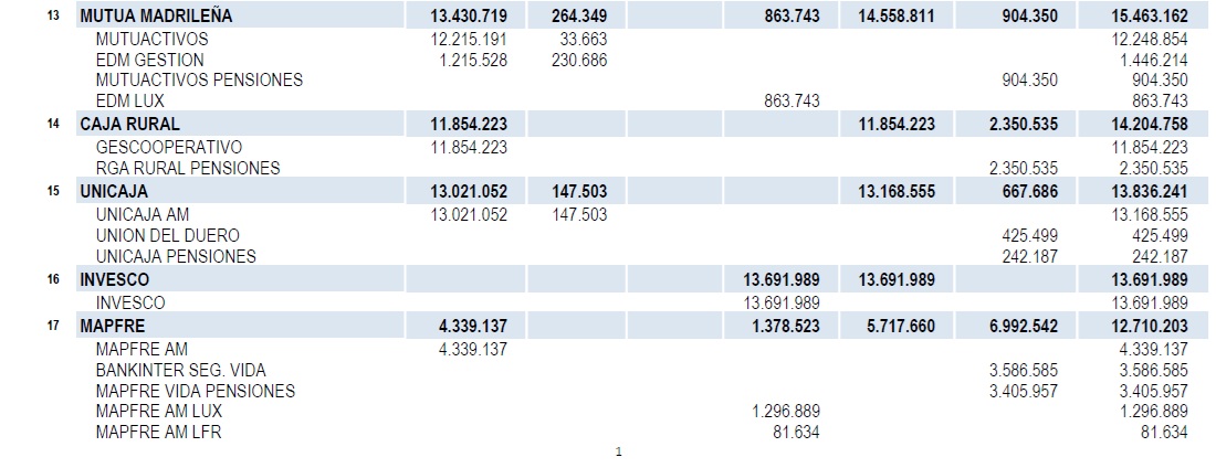 Tenemos que descender hasta la posición nº 13 para encontrar el primero de los grupos aseguradores que vuelve a ser Mutua Madrileña que suma 15.463 millones de euros gestionados, de los que 904 millones de euros corresponden a Fondos de Pensiones, gestionados por Mutuactivos Pensiones. La compañía ha perdido dos posiciones respecto al anterior trimestre.
