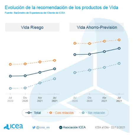 Repiten los directivos del sector que no hay nada mejor para promocionar un producto que los mismos usuarios lo hagan. Según los datos de ICEA, a través del Barómetro de Experiencia del Cliente, esto es lo que está pasando en los seguros de Vida. En el último año el informe observa "una tendencia positiva tanto en el producto de Vida Riesgo como en Ahorro-Previsión", explica.
