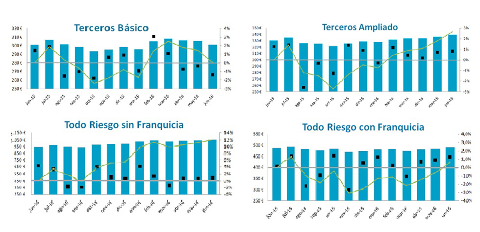 La evolución de la prima en las diferentes coberturas analizadas es dispar. En todas ellas se producen incrementos durante los últimos 12 meses. Si bien en las coberturas de Terceros (0,1%) y Todo Riesgo con Franquicia (0,6%) se producen pequeños incrementos. El ajuste al alza en sensiblemente superior en Terceros Ampliado (2,7%) y especialmente en Todo Riesgo con Franquicia (12,1%).