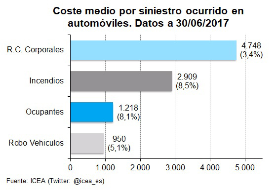 A junio de 2017, las garantías de Autos con costes más elevados son las de RC Corporal, con un importe medio de 4.748 euros y un incremento anual del 3,4%, seguida de la garantía de Incendios, con un coste medio de 2.909 euros (un 8,5% más) y de Ocupantes y Robo de vehículos, según los datos de ICEA.