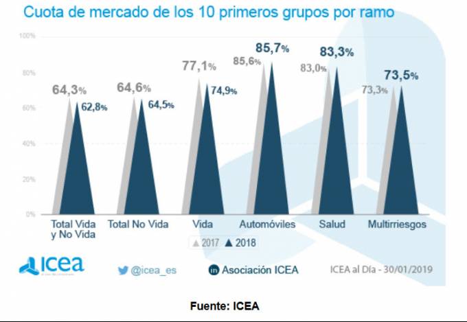 Por su parte, Vida es el único ramo donde la concentración ha caído pasando del 77,1% de hace un año al 74,9% con el que cerró 2018. De esta manera los principales grupos ahora tienen 2,14 pp menos de pólizas que el año anterior.