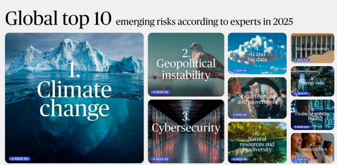 Y, como todos los años, este informe publica el ranking de los principales riesgos emergentes según la visión de los expertos. Y, por este orden, estos son los 10 riesgos que más están impactando en 2025: cambio climático, inestabilidad geopolítica, ciberseguridad, IA y big data, tensiones sociales, recursos naturales y biodiversidad, macroeconomía, riesgos energéticos, estabilidad financiera y demografía.