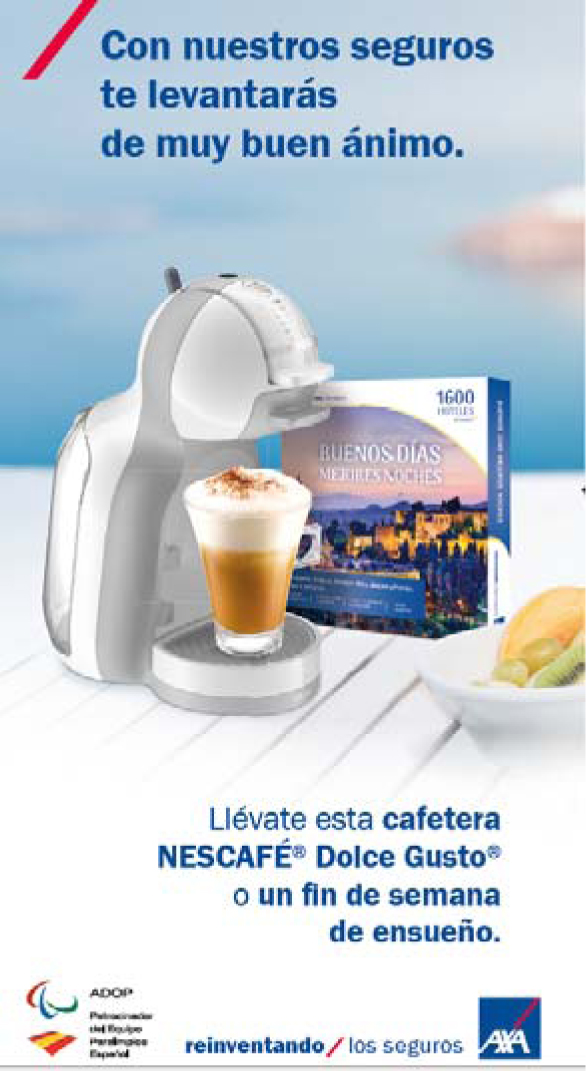 Con el lema “Con nuestros seguros te levantarás de muy buen ánimo’, AXA lanza en febrero una nueva campaña comercial dirigida a la contratación de nuevas pólizas. Desde el 1 de febrero y hasta el 31 de mayo AXA premiará a los clientes que contraten un seguro de Moto, Hogar, Accidentes, Vida Riesgo o PIAS, entre otros, con una cafetera Nescafé Dolce Gusto o una estancia de fin de semana en una selección de 1.600 hoteles en España.
