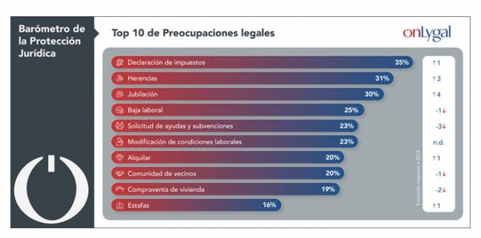 El Barómetro de la Protección Jurídica que hoy presenta onLygal pone de manifiesto que los principales asuntos legales que generan preocupación entre los españoles son 3. El primero de ellos es la declaración de impuestos (35%), seguido por las herencias (31%) y la jubilación (30%).