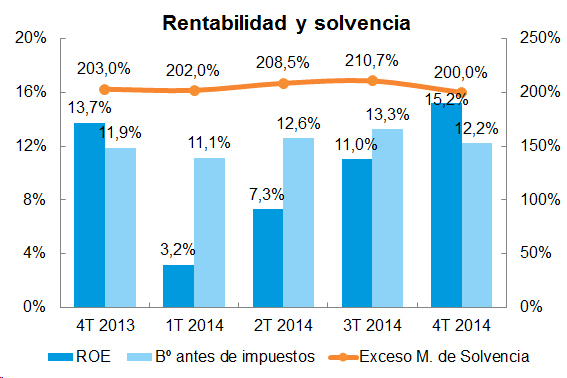 En 2014 el beneficio antes de impuestos del sector asegurador español fue del 12,2% sobre primas imputadas, un 0,3% más que el año anterior, según ICEA. Destaca el hecho de que la rentabilidad sobre recursos propios (ROE) fue del 15,2%, incrementándose en un 1,5% en términos interanuales. Por su parte, el exceso de margen de solvencia alcanzó el 200%, un 3% menos que en 2013, siendo del 121% en Vida y del 303,5% en No Vida.