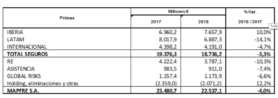 Las primas tuvieron una caída del 4% hasta alcanzar 22.537 millones. Según la aseguradora el impacto de la depreciación de las divisas tuvo un impacto en las primas de 1.439 millones. A tipo constante éstas hubieran crecido un 2,1%.