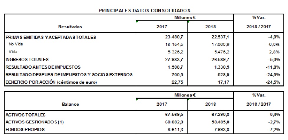 El beneficio de la compañía se situó en 529 millones, lo que indica una caída del 24,5% a 2017. El resultado operativo ascendió a los 702 millones (+0,3%), pero la compañía decidió fortalecer su balance dedicando 173 millones al deterioro parcial de fondos de comercio de las operaciones de seguros en Estados Unidos, Italia e Indonesia. Explica la compañía en una nota de prensa que se realiza para "adaptarse a las nuevas circunstancias de los mercados, manteniendo la rentabilidad para sus accionistas y sentando las bases para seguir creciendo con rentabilidad".