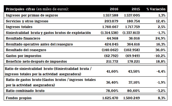 Los ingresos de explotación antes del reaseguro mejoraron un 16,3% hasta situarse en 424,0 millones, frente a los 364,6 millones de 2015. La evolución positiva registrada por los siniestros y los gastos dio como resultado un excelente ratio combinado bruto del 78,0%, frente al 80,6% de 2015.