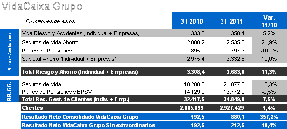 VidaCaixa Grupo obtuvo un beneficio neto recurrente de 212,5 millones de euros en los 9 primeros meses de 2011, un 10,4% más respecto al mismo periodo del año anterior. Si se incluyen los ingresos extraordinarios de la venta del 50% de SegurCaixa Adeslas a Mutua Madrileña y del grupo hospitalario, el beneficio neto consolidado del grupo alcanza los 880,1 millones, un 357,2% más. El número de clientes de VidaCaixa a 30 de septiembre aumentó ligeramente y roza los 3 millones.
