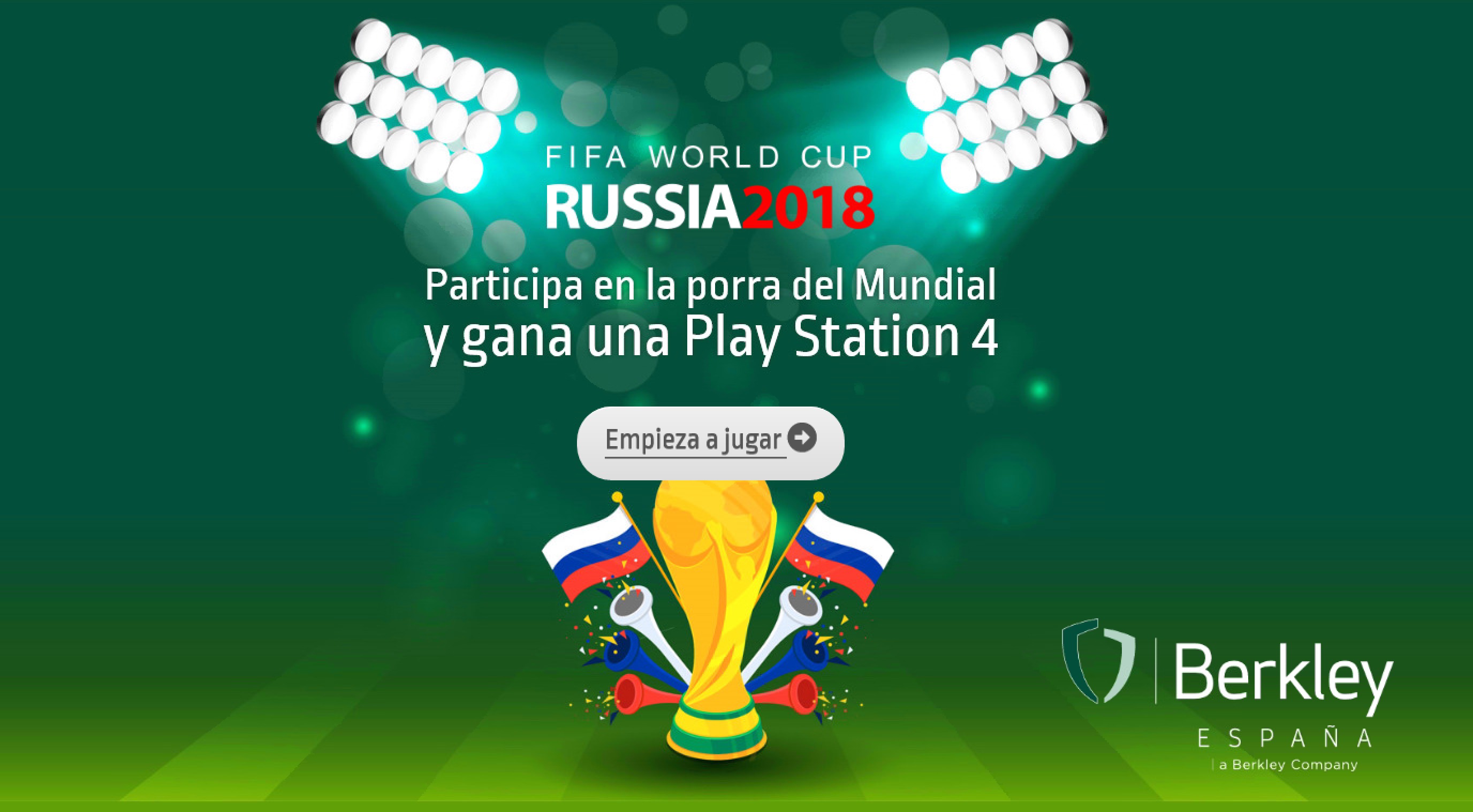 Berkley España ha creado una porra sobre el Mundial de Fútbol de Rusia que comienza este jueves entre sus corredores y suscriptores. El corredor que más puntos obtenga se llevará una Play Station 4 Pro. La entidad habilitará una terraza durante el España-Irán para ver el partido con un torneo de futbolín.