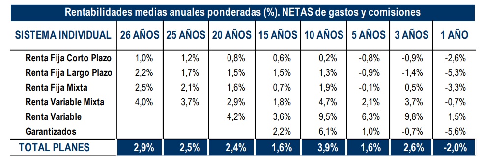 La rentabilidad a un año ha caído un 2% siendo los Planes de Renta Fija a largo plazo los más afectados con una caída media del 5,3%. Los de Renta Variable mixta han aguantado mejor cayendo el 0,7%.