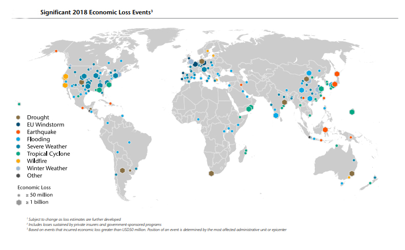 La principal causa de catástrofes en 2018 ha sido los ciclones tropicales con importantes tormentas tocando tierra. Entre ellos, el Huracán Michael y el Huracán Florence (EEUU), el Tifón Jebi y el Tifón Trami (Japón), el Tifón Mangkut (Filipinas, Hong Kong, China) y el Tifón Rumbla (China). Como resultado, 2017 y 2018 han sido los años más costosos de todos los registrados tanto en pérdidas económicas (653.000 millones de dólares) originadas solo por desastres climáticos como en pérdidas aseguradas en todo tipo de catástrofes (237.000 millones de dólares).