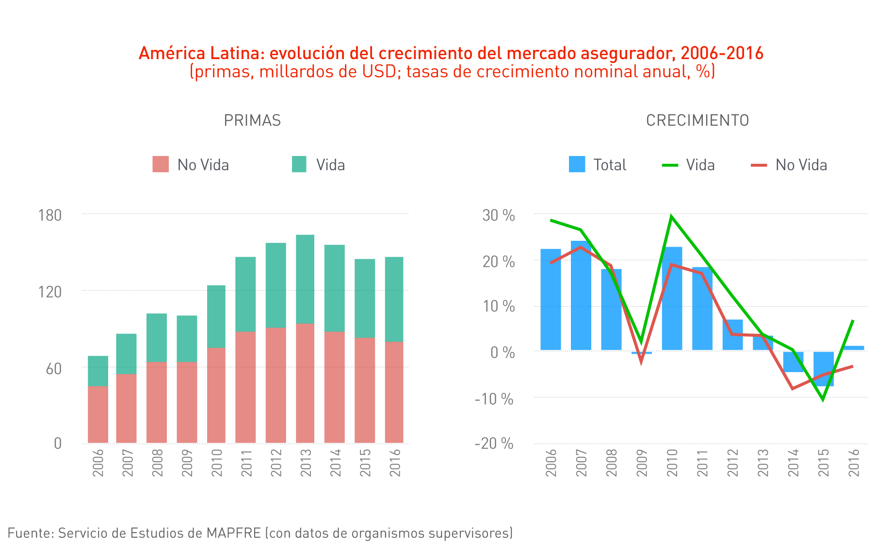 Brasil cuenta con 59.000 millones en primas liderando el mercado de la región, seguido de México con algo menos de la mitad y por delante de Argentina, Puerto Rico y Chile. En 2016 fue Costa Rica el país que más creció en primas con un avance del 16,1%, seguido de la República Dominica con el 12,1% y México con el 10,3%. Brasil creció en primas un 2,6%.