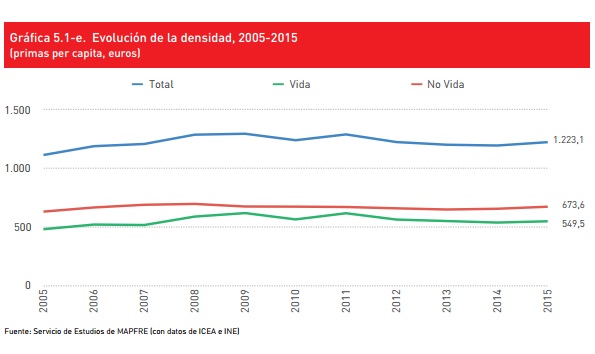 El informe también recoge, entre otros, datos de la densidad del seguro: el gasto per cápita en primas se situó en 2015 en 1.223,1 euros, 109,4 euros más que la observada una década atrás: 673,6 euros en No Vida y 549,5 euros en Vida.