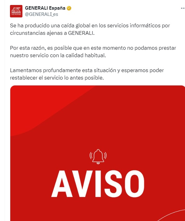 Generali fue la primera en emitir una nota a través de la red social X en la que explicó que debido a esta caída global "es posible que en este momento no podamos prestar nuestro servicio con la calidad habitual".