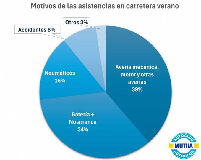 Los fallos más frecuentes en carretera están directamente relacionados con el calor. Casi un 40% de las asistencias veraniegas se deben a averías mecánicas, como problemas en el sistema de refrigeración, alimentación o transmisión. Le siguen los fallos eléctricos —principalmente en la batería— que representan el 34%. El resto de incidentes se reparten entre pinchazos o reventones (16%) y accidentes u otros contratiempos (8%).