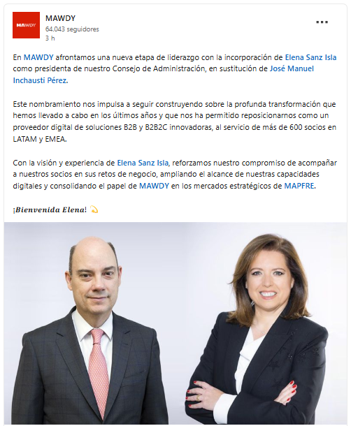 Mawdy, filial de asistencia de Mapfre, ha anunciado en LinkedIn que la compañía inicia una nueva etapa de liderazgo con la incorporación de Elena Sanz como presidenta del consejo de administración, reemplazando a José Manuel Inchausti.