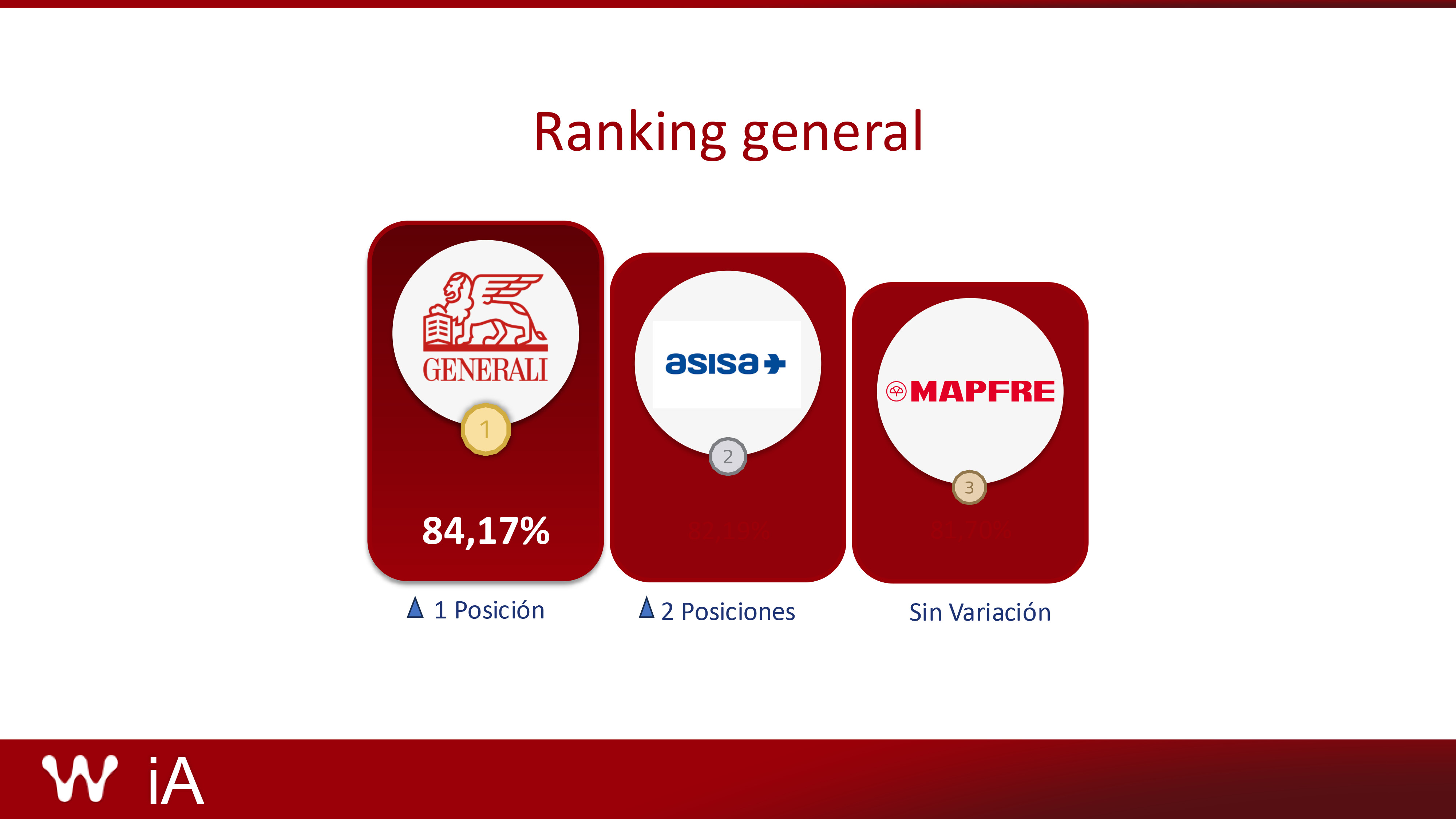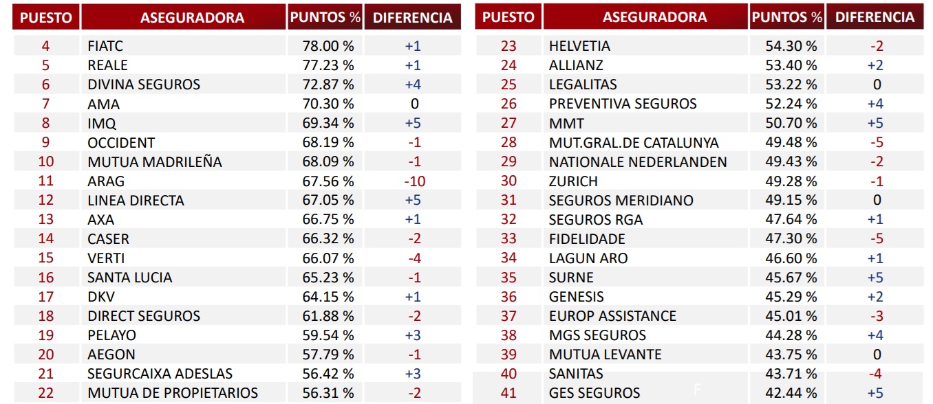 El podio lo completan Asisa, que protagoniza una destacada subida hasta el segundo lugar con un 82,19%, y Mapfre, que consolida su tercera posición con 81,70%. El top 10 lo completan Fiatc (78,00%), Reale (77,23%), Divina Seguros (72,87%), A.M.A. (70,30%), IMQ (69,34%), Occident (68,19%) y Mutua Madrileña (68,09%).