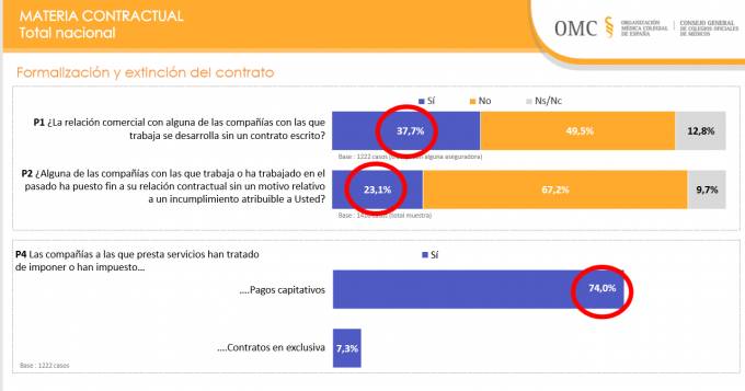 Parece que se abren varias grietas en la relación que mantienen los médicos con el sector asegurador. Para empezar, un 37,7% de los facultativos afirman que están desarrollando su actividad sin contar siquiera con un contrato escrito. Este dato tan contundente aparece en el reciente estudio 'Condiciones de competencia en el mercado del ejercicio libre de la medicina en España', elaborado por el Consejo General de Colegios Oficiales de Médicos (CGCOM), que ha realizado una encuesta on-line a 1.410 profesionales, de los cuales 1.222 están adscritos a alguna aseguradora.