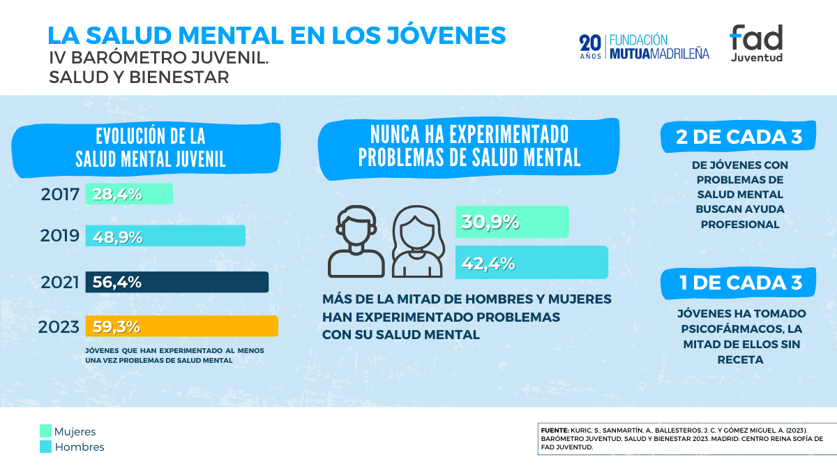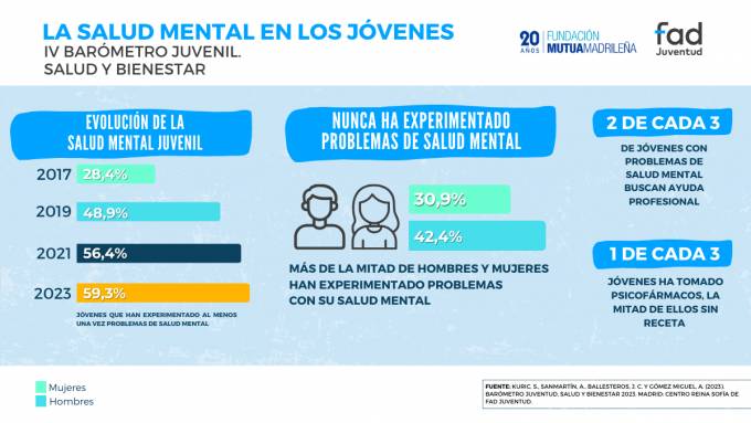 Casi el 60% de los jóvenes manifiesta haber tenido algún problema de salud mental en el último año, cuando en 2017 tan solo lo declaraba el 28,4%. Son las mujeres las más afectadas subiendo la cifra hasta el 71%. Son datos extraídos del "Barómetro Juvenil 2023. Salud y Bienestar" de la Fundación Mutua Madrileña y Fad Juventud que se realizó entrevistando a más de 1.500 jóvenes españoles de entre 15 y 29 años.