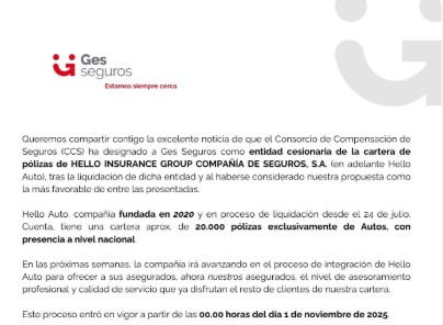 Detalla Ges Seguros que, "en las próximas semanas", irá "avanzando en el proceso de integración" y explica a los asegurados procedentes de Hello Insurance que esto "no supone ningún cambio en su póliza", que continúa "vigente con las mismas coberturas, condiciones y fecha de vencimiento".