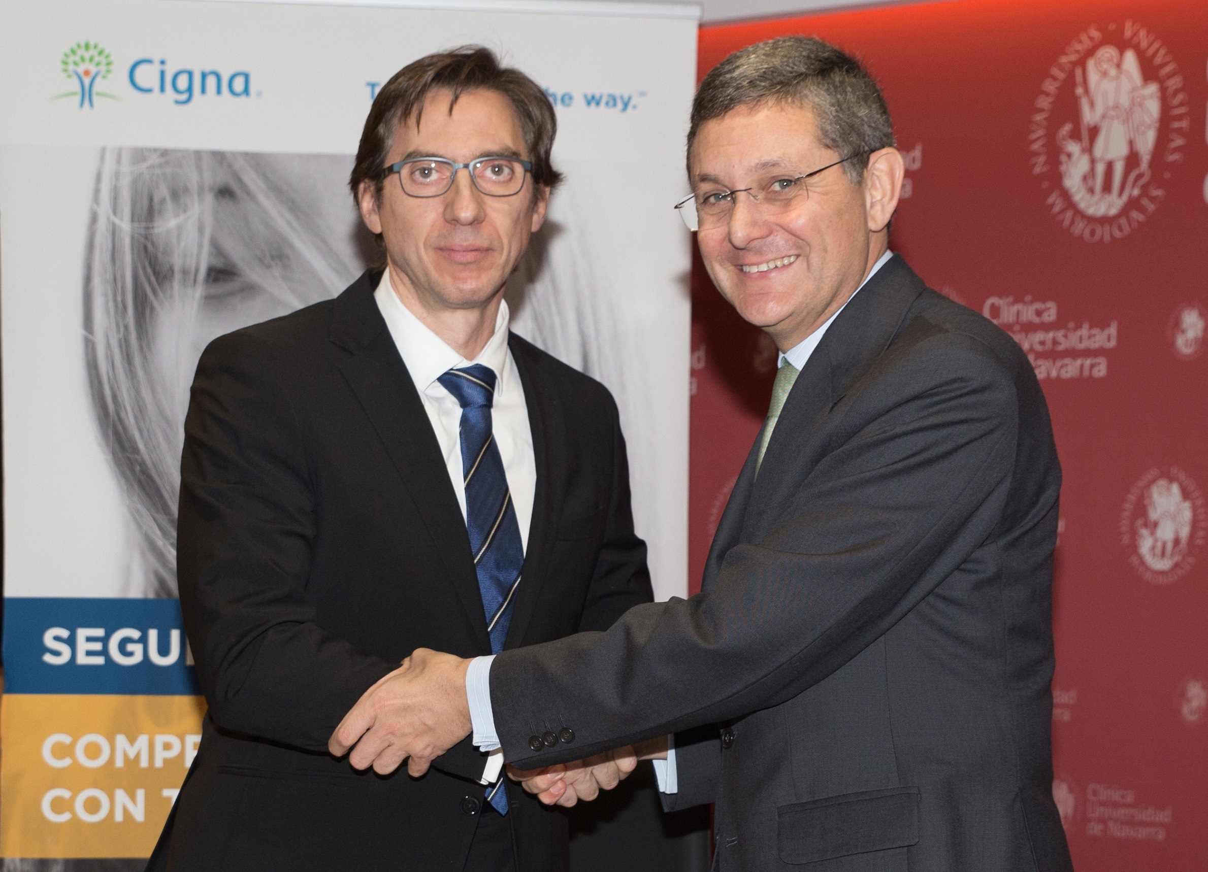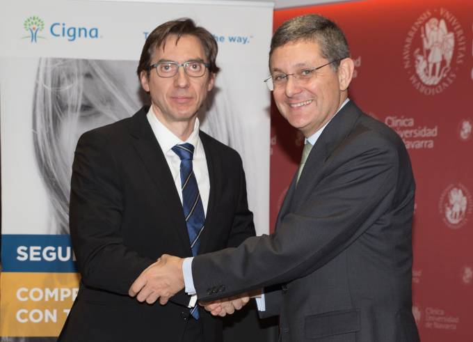 Cigna ha llegado a un acuerdo con la Clínica Universidad de Navarra para que gran parte de sus asegurados accedan al servicio médico de este hospital. La firma incluye un total de 46 especialidades médicas. El director general de la aseguradora, Juan José Montes, y el director general de la clínica, José Andrés Gómez, han sido los encargados de suscribir la alianza.