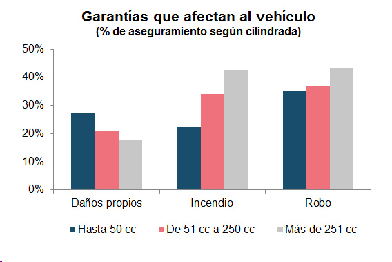 Los datos de ICEA confirman que en 2013 la cobertura opcional más contratada por los usuarios de seguros de Moto fue la robo, con el 40%, por delante de incendio (37%) y daños propios (20%). Otro dato relevante es que cuanto mayor es la cilindrada del vehículo, se aseguran en mayor medida las coberturas de incendio y robo frente a daños propios.